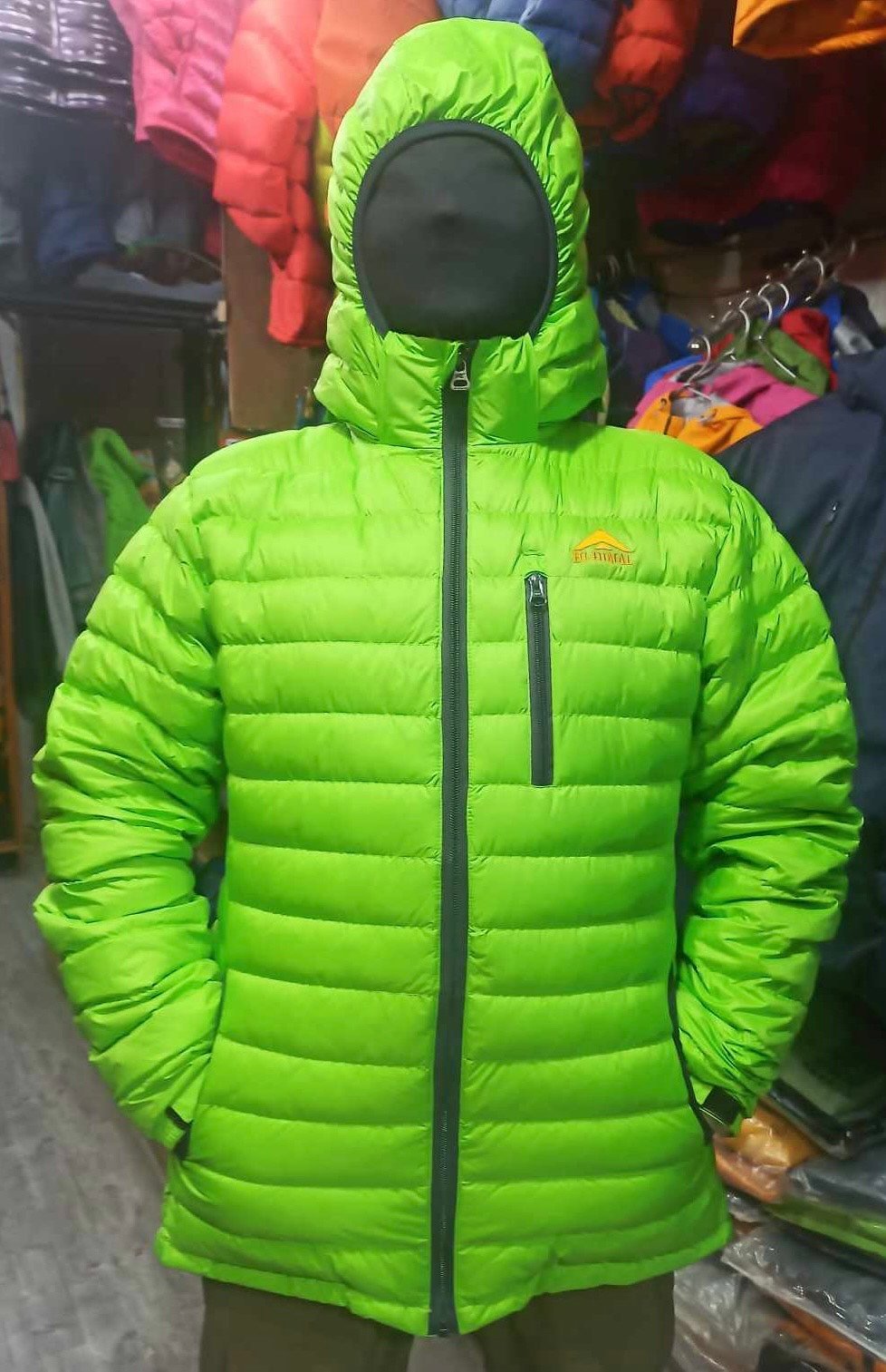 • Fabrics: Two Layers (Waterproof & Windproof rubberized) & Lightweight Nylon stitched together and put goose down by hand in the chambers silky taffeta lining inside.