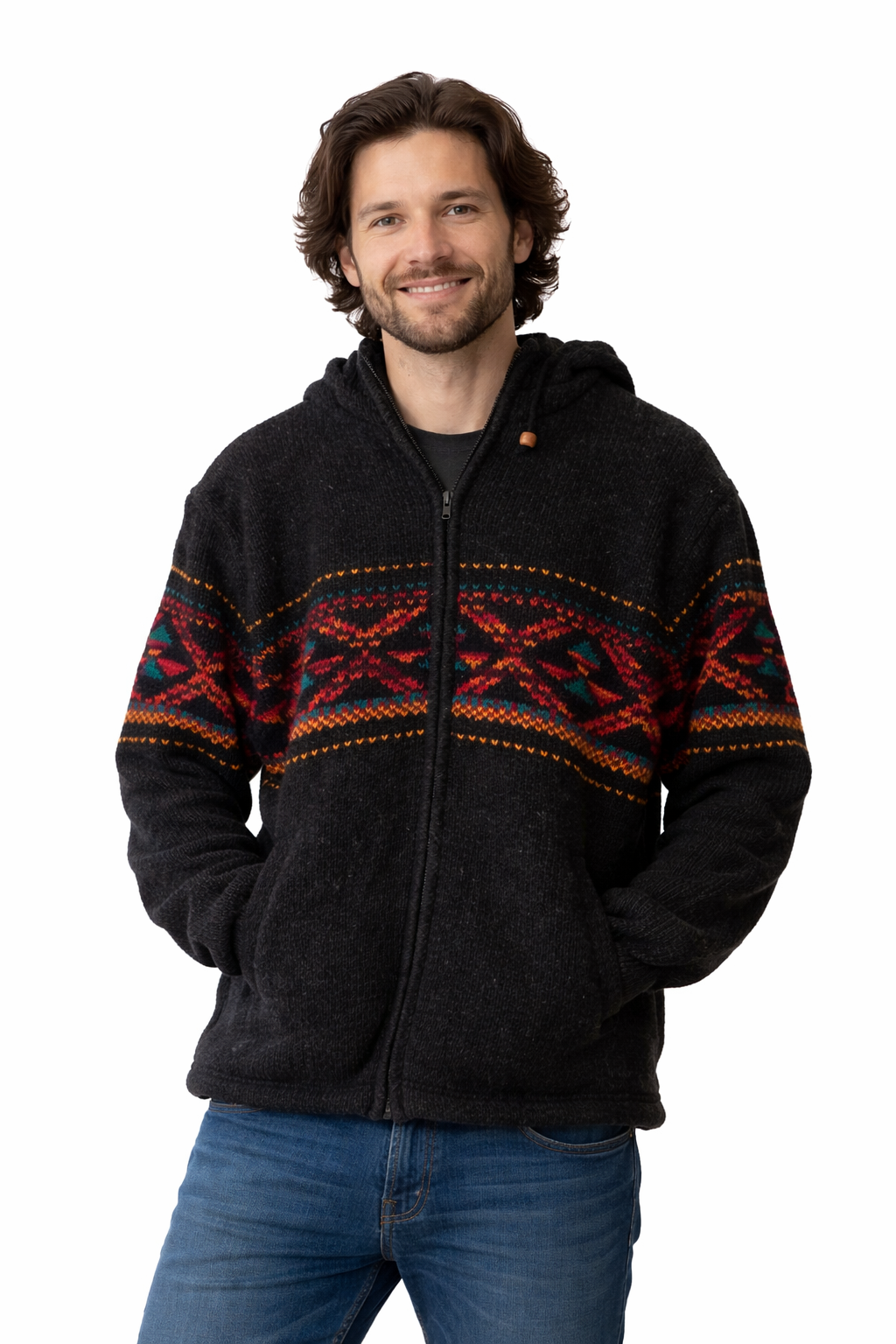 Stay warm in style with this handmade woolen jacket from Nepal, featuring a striking tribal pattern in vibrant red, orange, and teal tones. Crafted from 100% natural wool, this jacket is designed to provide superior warmth and comfort, perfect for cold weather. The full-zip hoodie design offers practicality, while the intricate tribal motifs add a bold, cultural touch to this cozy piece. Ethically made by skilled Nepali artisans, this jacket blends traditional craftsmanship with contemporary flair. Unisex and available in various sizes, it’s the ideal choice for those who appreciate unique, ethically sourced fashion that stands out.